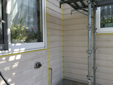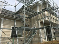 | 足場を組み立てるところからスタートです。 | 高圧洗浄で汚れやカビを根こそぎ取り除きます。 | 洗浄が終わり、養生を行って塗装に入ります。 |