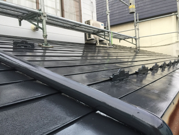 | 施工開始です。足場を設けます。 | ウレタン塗料でシーラー含む3回塗装を行いました。 | サビ止め、仕上げ塗りの二回塗装を行いました。 |