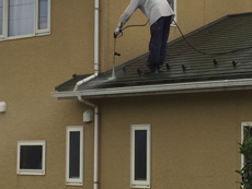 | 汚れやカビを高圧洗浄で綺麗に取り除きます。 | 洗浄後、スレート用シリコン塗料で下塗りを施していきます。 | 屋根にはスレート用シリコン塗料を計3回塗り重ねました。 |
